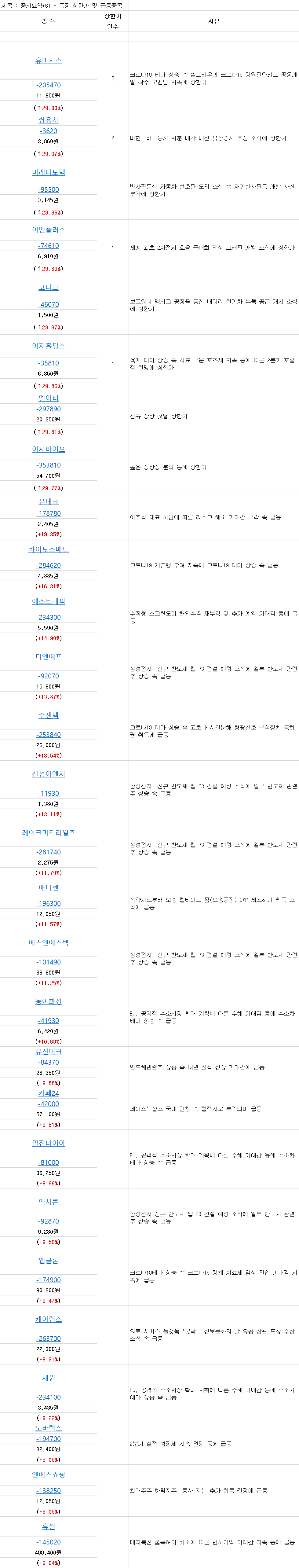 | ▷최근 코로나19 재유행 우려가 지속되고있는 가운데, 세계보건기구(WHO)는 전일(현지시간) 자체 집계결과 지난 24시간 동안 전 세계에서 18만3,020명의 신규 코로나19 확진자가 발생했다고 밝힘. 이는 하루 기준 역대 최고치임. 국가별로 브라질이 5만4,771명으로 신규 확진자가 가장 많았고, 미국이 3만6,617명으로 뒤를 이었음. 인도에서도 1만5,400명 이상의 신규 확진자가 나왔음. ▷한편, 언론에 따르면, 中 당국은 코로나19 확산 우려로 미국의 대형 육류회사 타이슨 푸드로부터의 닭고기 수입을 전면 제한한것으로 전해졌으며, 베이징에 위치한 펩시 공장에서 코로나19 확진자가 발생해 공장이 폐쇄된 것으로 알려짐. ▷이 같은 소식에 휴마시스, 수젠텍, 카이노스메드, 앱클론 등 코로나19(진단/치료제/백신 개발 등) 테마가 상승세를 기록. 한편, 휴마시스는 셀트리온과의 협업 모멘텀도 지속됐으며, 수젠텍은 시간분해 형광신호 분석장치 관련 특허권을 취득한 점도 주가에 긍정적으로 작용. |