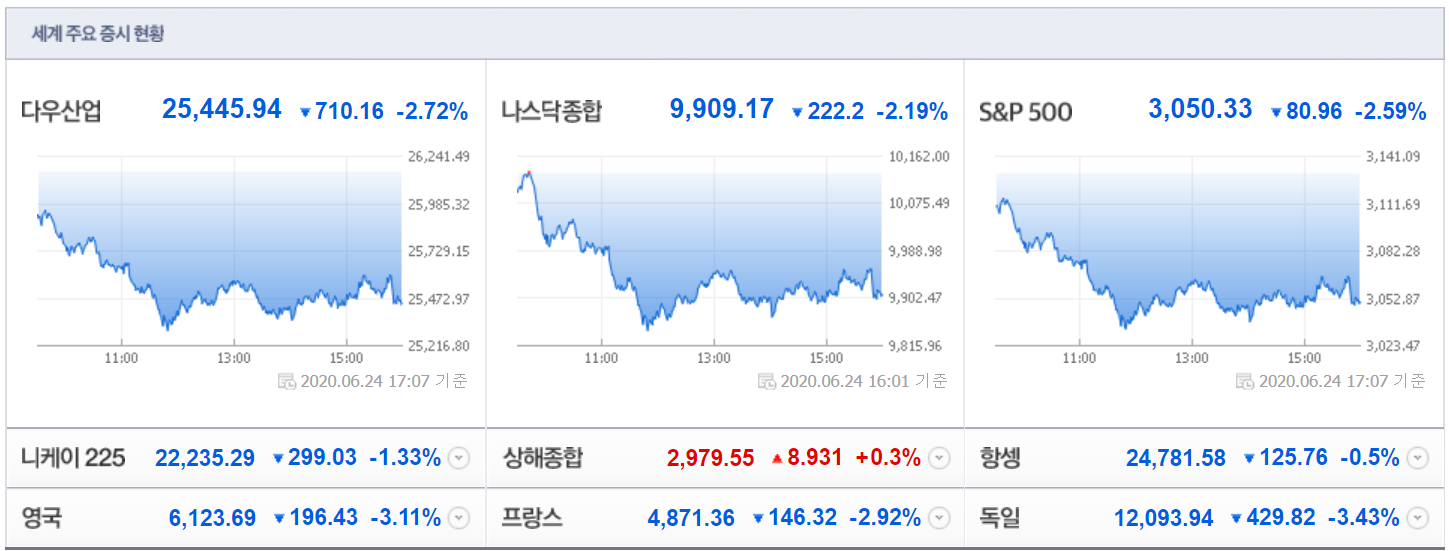 6/24(현지시간) 뉴욕증시가 코로나19 재유행 우려 등에 급락한 가운데, 주요 테마들도 일제히 하락. 특히, 델타 항공(-7.76%), 유나이티드 컨티넨탈 홀딩스(-8.34%), 아메리칸에어라인스 그룹(-6.86%) 등 항공과 윈 리조트(-11.00%), 라스베이거스 샌즈(-4.14%) 등 카지노, 익스피디아(-6.19%) 등 여행, 로얄 캐리비안(-11.26%) 등 크루즈 테마가 큰 폭 하락. 아울러 마이크론 테크놀로지(-3.11%) 등 반도체, 뱅크오브아메리카(-3.95%) 등 은행, AIG(-5.46%)등 보험, 마스타카드(-4.19%) 등 카드 테마도 하락했으며, 국제유가 급락 속 엑슨 모빌(-4.71%) 등 정유와 다우케미칼(-7.01%) 등 화학 테마도 하락.
