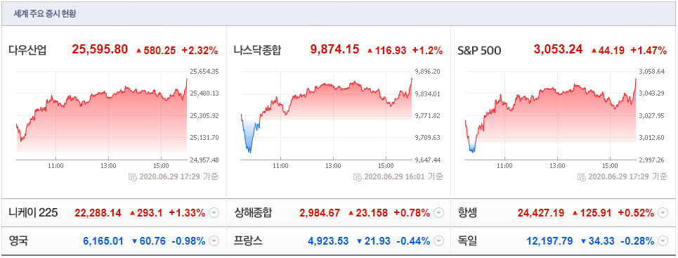 6/29(현지시간) 뉴욕증시가 경제지표 호조 및 추가 경기 부양 기대감 등에 큰 폭으로 상승한 가운데, 주요 테마들도 대부분 상승. 특히, 델타항공(+6.32%), 아메리칸 에어라인스 그룹(+7.59%) 등 항공과 윈 리조트(+7.49%) 등 카지노, 로얄 캐리비안 크루지스(+8.38%) 등 크루즈 등의 테마가 큰 폭 상승. 아울러 국제유가 급등 속 엑슨모빌(+1.60%) 등 정유, 다우케미칼(+2.96%) 등 화학 테마도 상승했으며, 테슬라(+5.17%) 등 전기차, GM(+3.43%) 등 자동차, 스타벅스(+2.67%) 등 음식료, 홈데포(+2.12%) 등 유통, 페덱스(+3.44%) 등 물류, 버라이즌(+2.88%) 등 통신, 골드만삭스(+2.26%) 등 은행 테마 등이 상승.