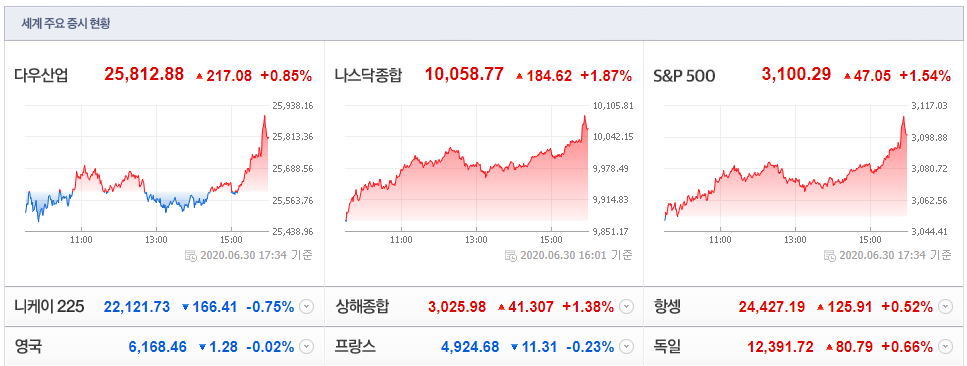 이 외 애플(+0.83%) 등 모바일, 마이크로소프트(+2.55%) 등 컴퓨터, 페이스북(+2.91%) 등 인터넷, 뱅크오브아메리카(+1.54%) 등 은행, AIG(+1.63%) 등 보험, 나이키(+2.27%) 등 소비재, 페덱스(+4.21%) 등 운송/물류, 길리어드 사이언스(+3.19%) 등 제약/헬스케어, 뉴몬트 마이닝(+3.70%) 등 금(金) 테마 등 대부분의 테마가 상승세를 기록.