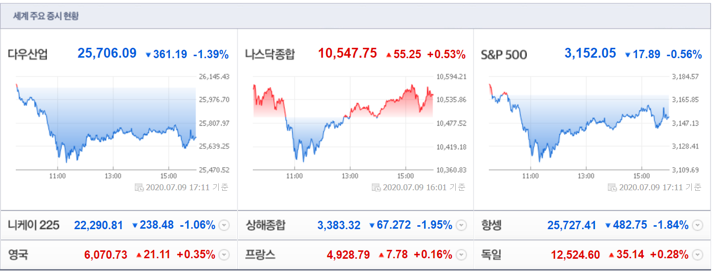 미국시장 테마시황7/9(현지시간) 뉴욕증시가 경제 재봉쇄 우려에도 기술주 강세 지속 등에 혼조 마감한 가운데, 주요 테마들은 하락 테마가 우세. 월그린부츠얼라이언스(-7.76%)가 부진한 실적발표 속 감원 계획 발표 등에 큰 폭으로 하락하는 등 제약/헬스케어 테마가 약세를 나타냈으며, 경제 재봉쇄 우려 등에 델타 항공(-5.04%),아메리칸에어라인스그룹(-6.76%) 등 항공, 카니발(-4.83%) 등 크루즈, 윈 리조트(-4.11%) 등 카지노 테마가 동반 하락. 골드만삭스(-2.68%)등 은행, AIG(-6.20%) 등 보험, 아메리칸 익스프레스(-2.51%) 등 카드 등 금융 관련 테마도 일제히 하락했고, GM(-6.09%) 등 자동차, 보잉(-3.78%) 등 산업재, 페덱스(-1.78%) 등 물류, 코라콜라(-2.57%) 등 음식료 테마 등이 하락. 국제 유가 급락 속 엑슨모빌(-4.13%) 등 정유와 다우케미칼(-2.26%) 등 화학 테마도 하락.