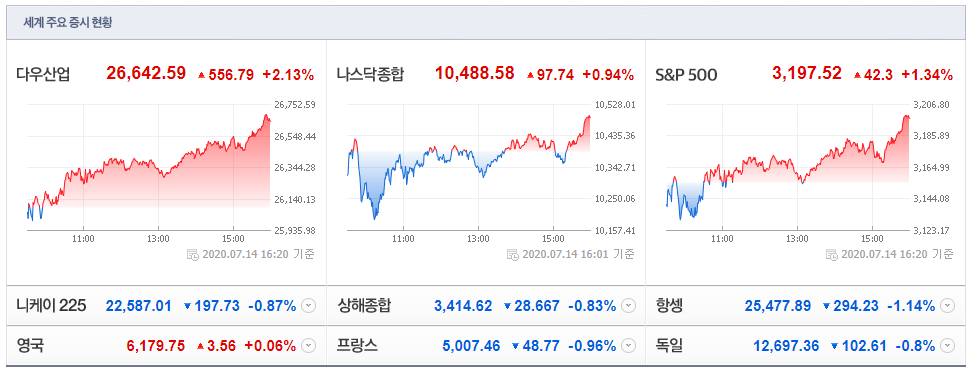 7/14(현지시간) 뉴욕증시가 경기부양 기대감 지속 및 코로나19 완화 기대감 등에 상승한 가운데, 주요 테마들도 대부분 상승. 특히, 모더나(+4.54%)가 오는 27일 코로나19 백신 3상 임상시험을 시작한다는 소식에 상승하는 등 제약/헬스케어 테마가 상승했고, 국제유가 상승 속 엑슨모빌(+3.31%) 등 정유와 다우케미칼(+2.91%) 등 화학 테마도 동반 상승.