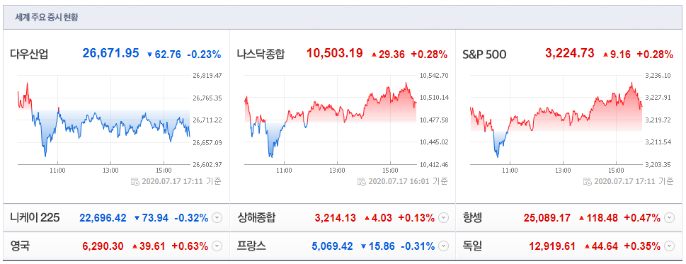 7/17(현지시간) 뉴욕증시가 코로나19 재확산 우려 속 엇갈린 경제지표 등에 혼조세를 보인 가운데, 주요 테마들도 엇갈린 모습. 특히, 화이자(+1.83%), 길리어드 사이언스(+1.14%) 등 제약/헬스케어 테마가 상승했고, 국제 금 가격 상승 속 뉴몬트 마이닝(+2.23%) 등 금(金) 테마도 상승. 아울러 퍼스트솔라(+3.34%) 등 태양광, 도미니언 에너지(+2.12%) 등 전력, 코카콜라(+1.45%) 등 음식료 테마 등도 양호한 모습.
