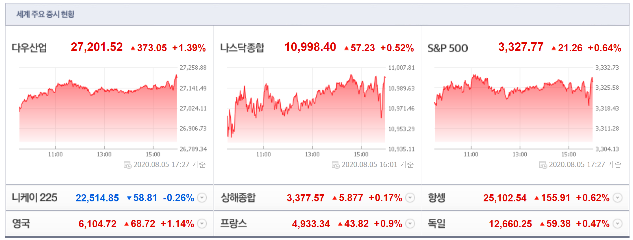 8/5(현지시간) 뉴욕증시가 美 고용 우려에도 부양책 기대 등에 상승한 가운데, 테마는 상승 테마가 우세한 모습. 특히, 공화당 상원의원 다수가 항공사 고용 유지를 위한 250억 달러 지원안을 신규 부양책에 포함해야 한다고 요청했다는 소식에 아메리칸 항공(+9.50%), 델타 항공(+3.12%) 등이 상승하는 등 운송/물류테마가 강세를 보였으며, 보잉(+5.58%) 등 산업재 테마도 상승. 국제유가 상승 속 셰브런(+0.82%), 엑슨 모빌(+0.87%) 등 정유 테마와 다우케미칼(+1.62%) 등 화학 테마도 상승했으며, 이 외 뱅크오브아메리카(+1.52%) 등 은행, 메트라이프(+3.74%) 등 보험, 마스타카드(+4.33%) 등카드, GM(+2.05%) 등 자동차, 퍼스트솔라(+2.64%) 등 태양광 테마도 상승세를 기록.
