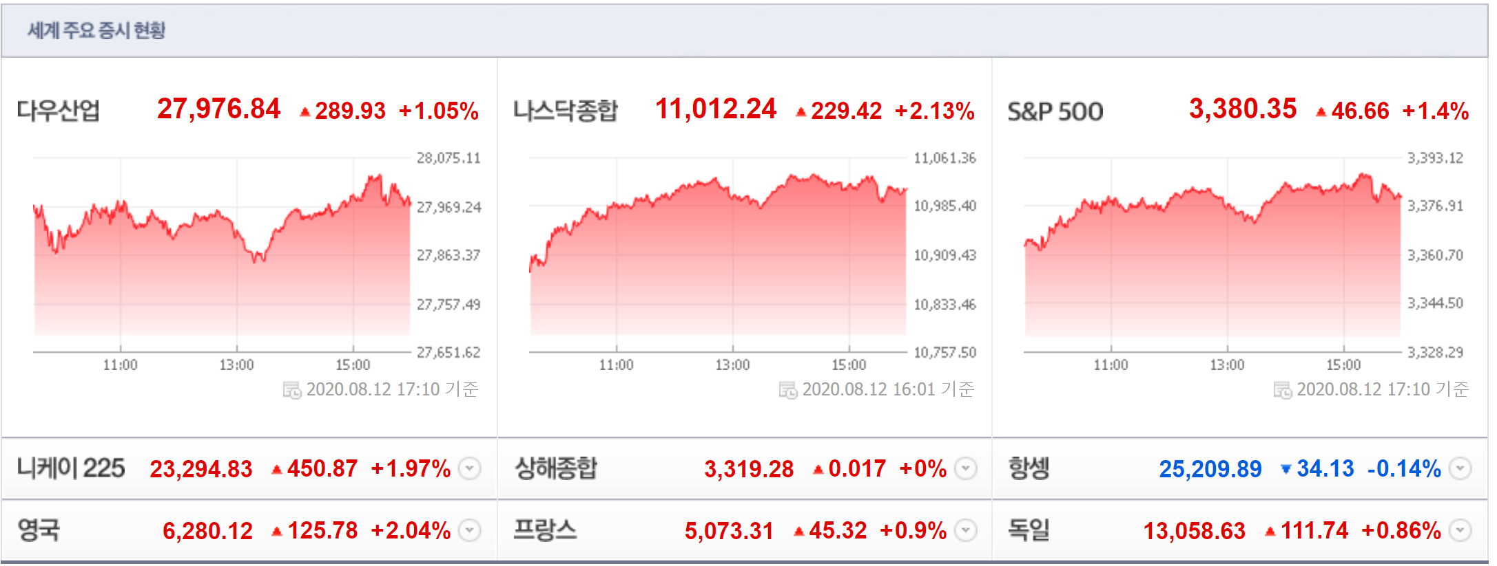 8/12(현지시간) 뉴욕증시가 美 소비자물가 지표 호조, 코로나19 백신 기대감 지속, 기술주 반등 등에 큰 폭으로 상승한 가운데, 주요 테마들도 대부분 상승. 특히, 테슬라(+13.12%)가 5대1 주식 액면 분할 계획 등에 급등한 가운데 전기차 테마가 상승했고, 애플(+3.32%) 등 모바일, 마이크로소프트(+2.86%) 등 컴퓨터, 아마존(+2.65%), 알파벳A(+1.80%), 페이스북(+1.47%) 등 인터넷, 넷플릭스(+1.83%) 등 미디어 등 주요 기술주 관련 테마들이 일제히 상승.