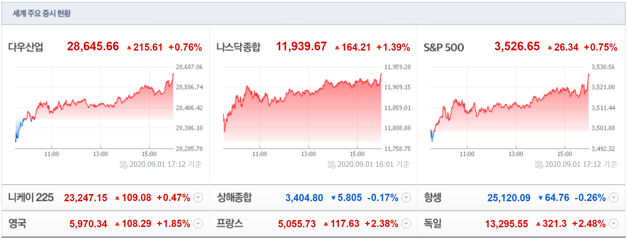 9/1(현지시간) 뉴욕증시가 제조업지표 호조 및 기술주 강세 등에 상승한 가운데, 주요 테마들도 상승 테마가 우세. 특히, 애플(+3.98%)이 액면분할 효과 지속 및 목표주가 상향 조정 소식 등에 상승하는 등 모바일 테마가 상승했고, 넷플릭스(+5.10%) 등 미디어, 알파벳A(+1.57%), 아마존(+1.40%) 등 인터넷, 마이크로소프트(+0.77%) 등 컴퓨터 등 주요 기술주 관련 테마들도 일제히 상승. AMD(+1.50%), 엔비디아(+3.37%) 등 반도체 테마도 상승했고, 다우케미칼(+4.77%) 등 화학, 퍼스트솔라(+2.39%), 캐터필러(+2.63%), 3M(+1.09%) 등 산업재 테마 등도 양호한 모습을 나타냄. 아울러 월마트(+6.29%)가 ‘아마존 프라임’ 같은 서비스인 ‘월마트 플러스(+)’ 출시를 발표한 가운데 큰 폭으로 상승하는 등 유통 테마도 상승.