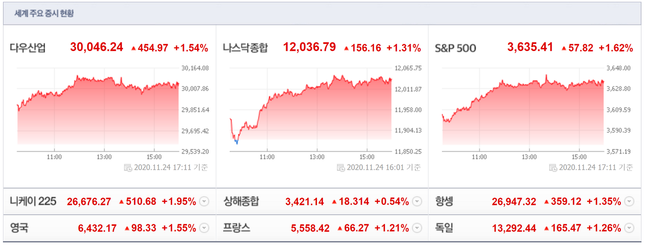 11/24(현지시간) 뉴욕증시가 美 정권이양 불확실성 완화, 코로나19 백신 개발 기대감 지속 등에 큰 폭으로 상승한 가운데, 주요 테마들도 대부분 상승. 특히, 테슬라(+6.43%)가 오는 12월21일 S&P500 지수 편입을 앞두고 연일 상승세를 이어가며 시가총액이 5,000억 달러를 돌파하는 등 전기차 테마가 강세를 나타냈고, 코로나19 백신 기대감 속 델타항공(+6.37%), 사우스웨스트항공(+6.43%), 유나이티드 컨티넨탈 홀딩스(+9.85%) 등 항공과 라스베가스 샌즈(+2.45%) 등 카지노, 로얄 캐리비안 크루즈(+7.72%) 등 크루즈, 익스피디아(+1.83%) 등 여행 등 항공/여행 관련 테마들도 연일 상승. 국제유가상승세 지속 속 엑슨 모빌(+6.66%), 셰브론(+5.04%) 등 정유와 다우케미칼(+3.20%) 등 석유화학 테마도 동반 상승.