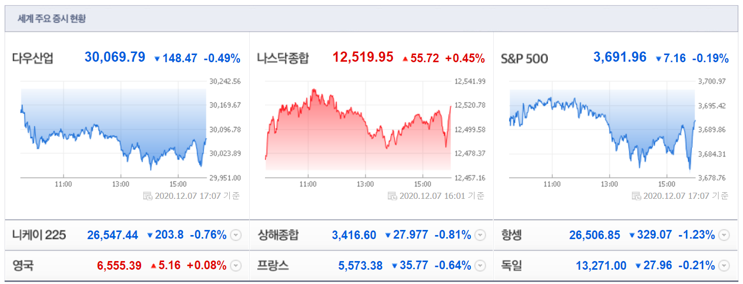 12/7(현지시간) 뉴욕증시가 코로나19 사태 악화 속 혼조 마감한 가운데, 주요 테마들은 하락 테마가 우세. 특히, 코로나19 사태 악화에 따른 국제유가 하락 속 엑슨모빌(-1.87%), 셰브런(-2.70%) 등 정유와 다우 케미칼(-3.34%) 등 석유화학 테마가 하락. 모건스탠리(-1.14%) 등 은행, AIG(-2.21%) 등 보험, 포드(-1.28%) 등 자동차, 코카콜라(-1.60%) 등 음식료, 홈데포(-0.51%) 등 유통, 캐터필러(-1.92%) 등 산업재, 마스타카드(-0.98%) 등 카드 등의 테마가 하락.
