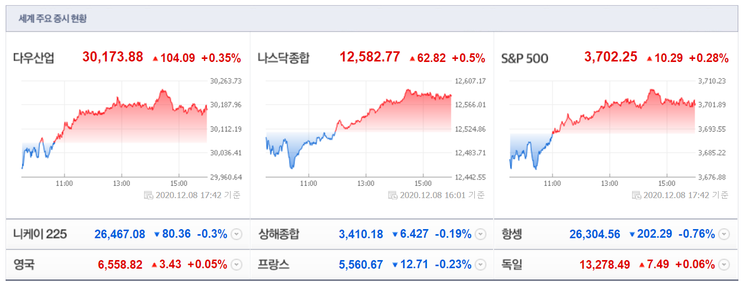 12/8(현지시간) 뉴욕증시가 경기부양책 기대감 및 코로나19 백신 기대감 지속 등에 상승한 가운데, 주요 테마들도 상승 테마가 우세. 특히, 테슬라(+1.27%)가 오는 21일 S&P500지수 일괄 편입을 앞두고 50억달러 규모 유상증자를 발표한 가운데 사상 최고치를 재차 경신하는 등 전기차 테마가 상승. 화이자(+3.18%)가 美 FDA 긴급 사용승인 임박 소식에 상승했으며, 존슨앤존슨(+1.73%)도 예상보다 빠른 코로나19 백신 3차 임상결과 발표 기대감 등에 상승하는 등 제약/헬스케어 테마도 양호한 모습.