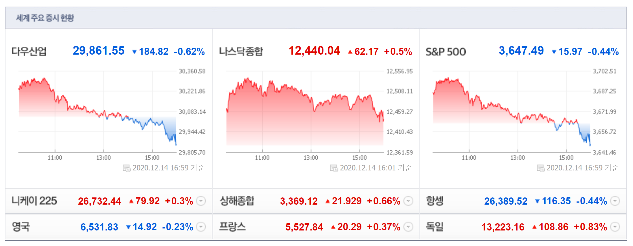 12/14(현지시간) 뉴욕증시가 코로나19 백신 접종 시작에도 경제 재봉쇄 우려 등에 혼조 마감한 가운데, 주요 테마들은 하락이 우세. 특히, 델타항공(-2.52%), 사우스웨스트항공(-1.35%), 유나이티드 컨티넨탈 홀딩스(-3.39%) 등 항공과 윈 리조트(-3.10%) 등 카지노, 로얄 캐리비안 크루즈(-3.14%) 등 크루즈 등 여행 관련 테마들이 하락했고, 엑슨모빌(-3.61%) 등 정유, 다우케미칼(-1.74%) 등 석유화학, 포드(-1.22%) 등 자동차, GE(-2.96%) 등 산업재, 페덱스(-1.36%) 등 물류, 월마트(-0.92%) 등 유통, 뱅크오브아메리카(-1.23%) 등 은행, AT&T(-1.48%) 등 통신 테마 등이 하락.