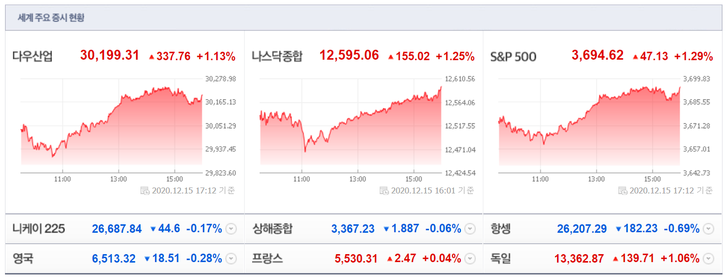 12/15(현지시간) 뉴욕증시가 경기부양책 타결 기대감 및 코로나19 백신 기대감 지속 등에 상승한 가운데, 주요 테마들도 대부분 상승. 특히, 애플(+5.01%)이 내년 상반기에 아이폰 생산을 약 30% 늘릴 계획이란 소식이 전해지며 큰 폭으로 상승하는 등 모바일 테마가 상승했고, AMD(+2.47%), 마이크론 테크놀로지(+2.25%) 등 반도체, IBM(+1.94%) 등 컴퓨터, 알파벳A(+0.50%) 등 인터넷, 월트디즈니(+2.74%) 등 미디어 테마가 상승.