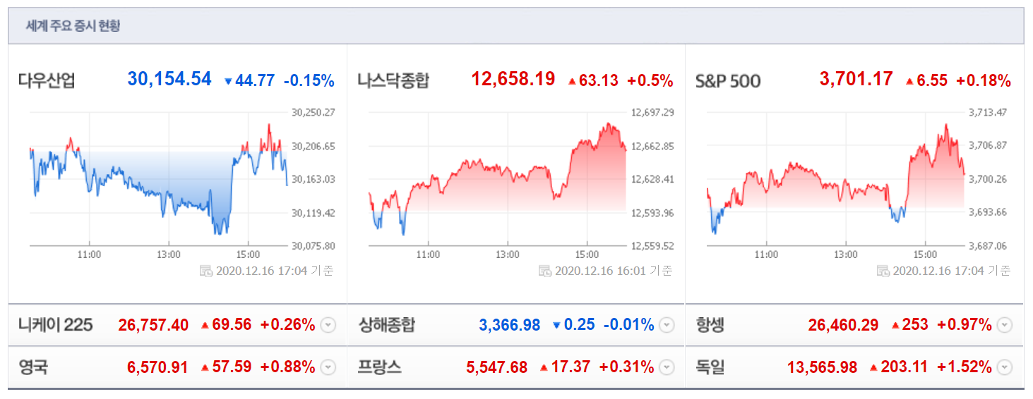 12/16(현지시간) 뉴욕증시가 경기부양책 타결 기대에도 FOMC 실망감, 소비지표 부진 등에 혼조 마감한 가운데, 주요 테마도 엇갈린 모습. 국제 금 가격 상승 속 뉴몬트 마이닝(+2.03%) 등 금(金) 테마가 상승했고, 아마존(+2.40%), 페이스북(+0.04%) 등 인터넷, 마이크로소프트(+2.41%) 등 컴퓨터, 골드만삭스(+0.55%) 등 은행, 페덱스(+1.07%) 등 물류, 퍼스트솔라(+0.56%) 등 태양광 테마 등이 양호한 모습을 보임.