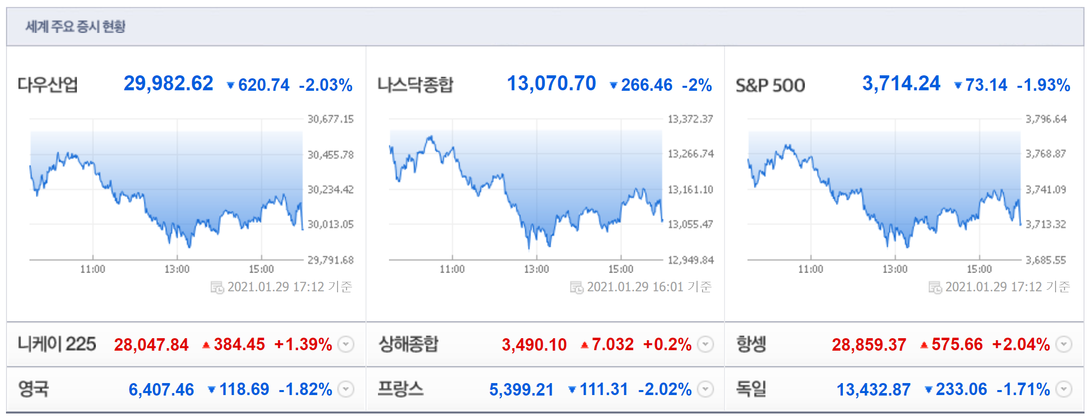 1/29(현지시간) 뉴욕증시가 게임스탑 과열 우려 및 코로나19 백신 보급 우려 등에 급락한 가운데, 주요 테마들도 대부분 하락. 특히, 애플(-3.74%) 등 모바일, 마이크로소프트(-2.92%) 등 컴퓨터, 아마존(-0.97%), 페이스북(-2.52%), 알파벳A(-1.39%) 등 인터넷, 넷플릭스(-1.15%) 등 미디어 등 주요 기술주 관련 테마들이 일제히 하락했고, 테슬라(-5.02%) 등 전기차 테마도 하락. 아울러 셰브론(-4.29%)이 국제유가 하락 속 실적 실망감 등에 하락하는 등 정유 테마가 하락.