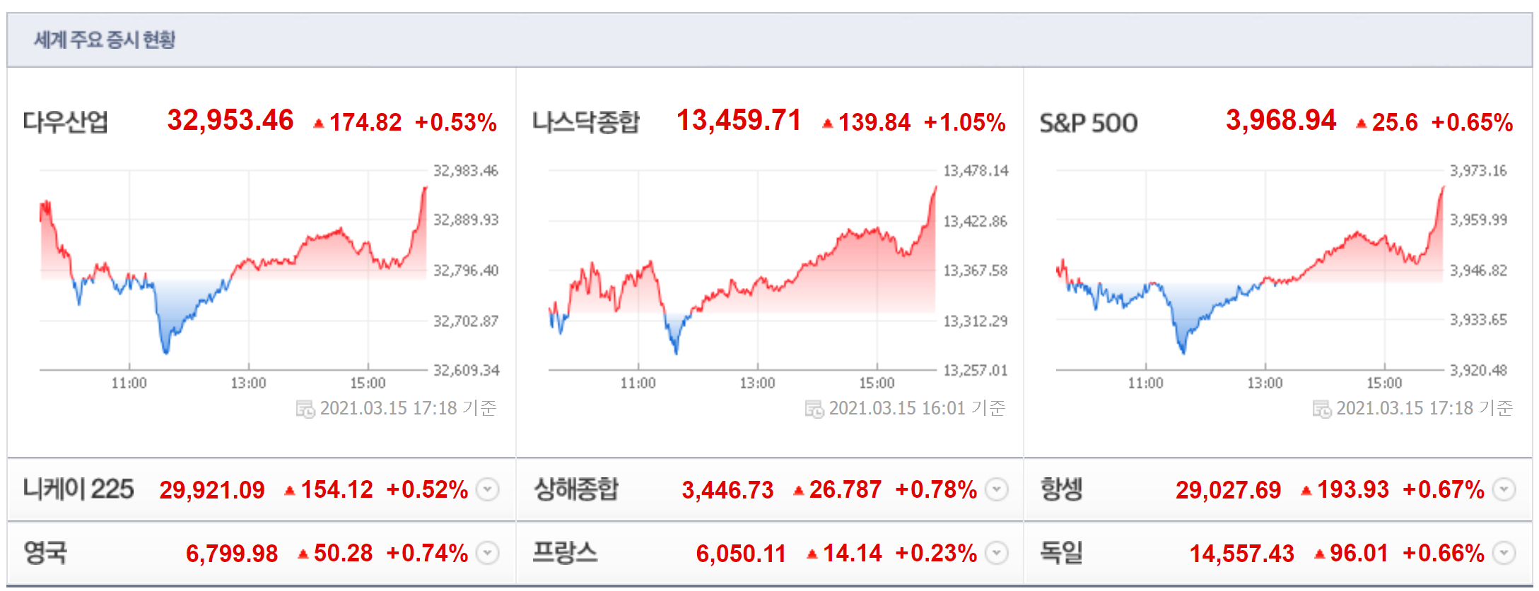 3/15(현지시간) 뉴욕증시가 경기회복 기대감 및 美 국채 금리 하락 등에 상승한 가운데, 주요 테마들도 대부분 상승. 특히, 美 국채 금리 안정 속 애플(+2.45%) 등 모바일,테슬라(+2.05%) 등 전기차, 알파벳A(+0.22%), 페이스북(+1.99%) 등 인터넷, 넷플릭스(+0.43%) 등 미디어 등 주요 기술주 관련 테마들이 반등에 성공했고, 경제 회복 기대감 속에 델타항공(+2.29%), 유나이티드 컨티넨탈 홀딩스(+8.26%), 아메리칸 에어라인스(+7.70%) 등 항공과 로얄캐리비안 크루즈(+4.80%) 등 크루즈, 윈 리조트(+2.01%) 등 카지노, 익스피디아(+1.44%) 등 여행 테마가 강세.