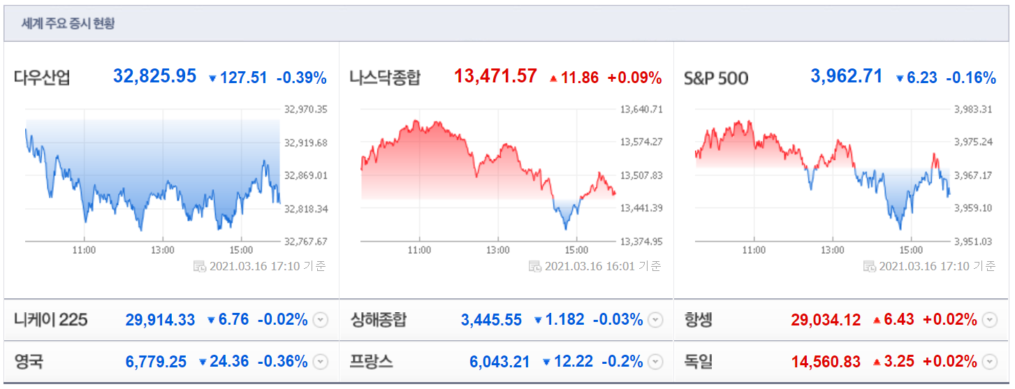 3/16(현지시간) 뉴욕증시가 FOMC관망세 속 혼조 마감한 가운데, 주요 테마들은 하락 테마가 우세. 특히, 폭스바겐이 최근 공격적인 전기차 전략을 발표한 가운데 경쟁 업체인 테슬라(-4.39%), 포드(-5.38%), GM(-1.42%) 등이 하락하는 등 전기차, 자동차 테마가 하락했고, 최근 강세를 나타냈던 골드만삭스(-1.25%), JP모건체이스(-1.20%) 등 은행과 델타항공(-3.14%) 등 항공, 로얄 캐리비안 크루즈(-5.32%) 등 크루즈, 윈 리조트(-1.60%) 등 카지노, 익스피디아(-0.41%) 등 여행 등의 테마도 하락. 아울러 AIG(-2.09%) 등 보험, 보잉(-3.92%) 등 산업재, 니콜라(-7.09%) 등 수소, 선파워(-7.98%) 등 태양광, 스퀘어(-3.13%) 등 전자결제, 버진 갤럭틱 홀딩스(-6.58%) 등 우주, US스틸(-7.91%) 등 철강 테마 등이 하락.