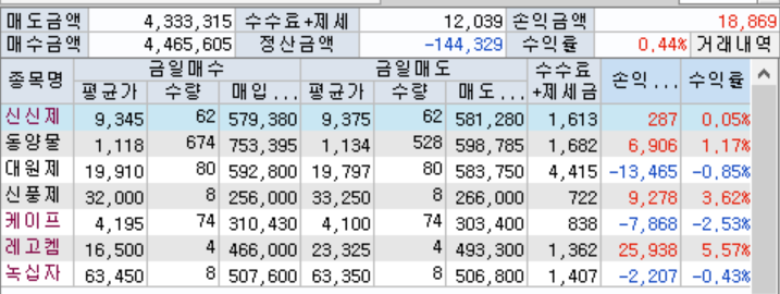 오늘 레고켐, 신풍제약, 신신제약 테마 추세매매로 4만원 가량을 수익을 내었고