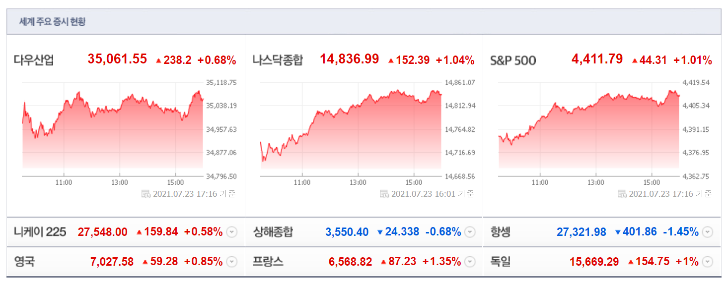 7/22(현지시간) 뉴욕증시가 기술주 강세 등에 상승한 가운데, 주요 테마들은 등락이 엇갈림. 애플(+0.96%) 등 모바일, 마이크로소프트(+1.68%) 등 컴퓨터, 아마존(+1.47%), 알파벳A(+0.68%), 페이스북(+1.43%) 등 인터넷 등 주요 기술주 관련 테마들이 상승했고, 로블록스(+2.65%) 등 게임, 쇼피피아(+1.58%) 등 전자결제, 화이자(+1.10%) 등 제약/바이오, 코스트코 홀세일(+0.61%) 등 유통 등의 테마가 상승.