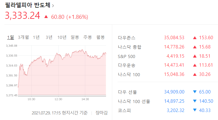 반면, 니콜라(-15.22%)가 연방 검찰이 창업자 트레버 밀턴을 사기 혐의로 기소했다는 소식에 급락하는 등 수소차 테마가 하락했고, 페이스북(-4.01%)이 2분기 호실적에도 불구하고 향후 매출 성장 둔화 우려 등에 하락하는 등 인터넷 테마도 부진한 모습. 페이팔(-6.23%)이 예상을 하회하는 실적 전망을 내놓은 가운데 큰 폭으로 하락하는 등 전자결제 테마도 부진한 모습을 나타냈고, 코인베이스(-2.47%) 등 암호화폐, 로블록스(-2.88%) 등 게임, 사우스웨스트 항공(-0.41%) 등 항공, 라스베가스 샌즈(-3.42%) 등 카지노, 퓨얼셀 에너지(-1.83%) 등 연료전지 등의 테마가 하락.