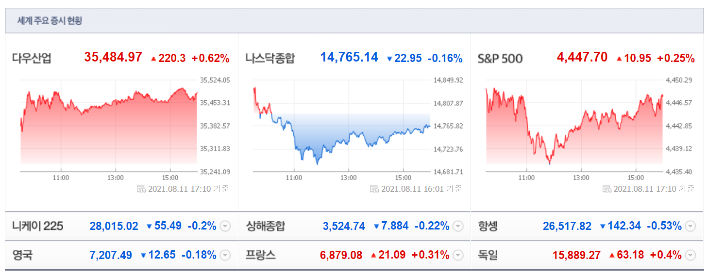 8/11(현지시간) 뉴욕증시가 물가지표 안도감 속 혼조 마감한 가운데, 주요 테마들은 상승 테마가 우세. 특히, 인프라 투자 기대감 속 캐터필러(+3.55%)가 상승세를 이어가는등 산업재 테마가 상승했고, 경제 재개 기대감 속 델타항공(+2.08%), 아메리칸항공그룹(+1.38%) 등 항공, 카니발(+1.44%) 등 크루즈, 익스피디아(+0.99%) 등 여행 등 경제 재개 수혜 테마가 상승. 국제 유가 상승 속 엑슨 모빌(+0.29%), 셰브런(+0.75%) 등 정유, 다우케미칼(+1.77%) 등 석유화학 테마도 상승했고, 금 가격 반등 속 뉴몬트 마이닝(+2.08%) 등 금(金) 테마가 상승. 이 외 포드(+0.80%) 등 자동차, 페덱스(+1.85%) 등 물류, 홈데포(+1.67%) 등 유통, 메트라이프(+1.41%) 등 보험, 씨티그룹(+1.81%) 등 은행, 코인베이스(+3.24%) 등 암호화폐 테마 등이상승.