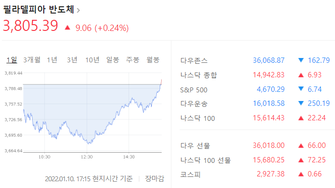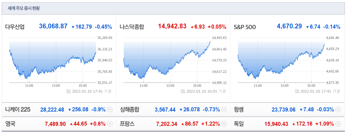 반면, 모더나(+9.28%)가 올 초 코로나19 오미크론 변이종을 예방하기 위한 전용 mRNA 백신 임상을 시행할 계획이라고 발표한 가운데 현재 시판 중인 백신의 3차 접종효과가 2차접종 완료때보다 최대 83배로 증가한 것으로 확인됐다는 소식에 급등했고, 화이자(+0.93%)가 오는 3월 오미크론 전용 백신이 개발될 것이라고 발표한 가운데 소폭 상승하는 등 제약/바이오 테마가 상승. 인텔(+3.31%) 등 반도체, 어도비(+2.96%), 오라클(+2.02%) 등 S/W 및 IT 서비스, 웰스 파고(+1.06%) 등 은행, 뉴몬트 마이닝(+1.68%) 등 금(金) 테마 등이 양호한 모습.