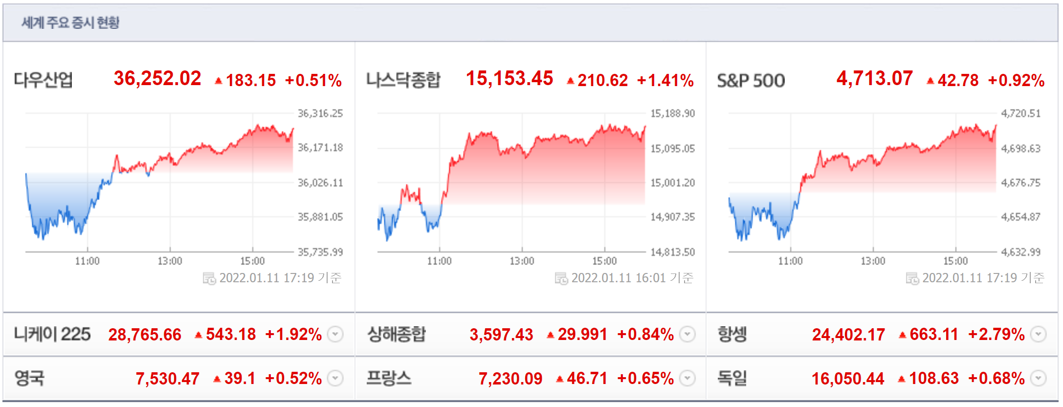 1/11(현지시간) 뉴욕증시가 Fed 조기 긴축 우려 일부 완화 및 저가 매수세 유입 등에 상승한 가운데, 주요 테마들도 대부분 상승. 특히, 10년물 국채금리 하락 속 저가 매수세유입 등에 애플(+1.68%) 등 모바일, 마이크로소프트(+0.23%) 등 컴퓨터, 아마존(+2.40%), 알파벳A(+0.77%), 메타(+1.92%) 등 인터넷, 넷플릭스(+0.18%) 등 미디어, 엔비디아(+1.52%) 등 반도체, 테슬라(+0.59%) 등 전기차 등 주요 기술주 관련 테마들이 상승했고, 국제유가 급등 속엑슨 모빌(+4.21%), 셰브론(+2.29%) 등 정유와 다우케미칼(+1.34%) 등 석유화학 테마가 강세.