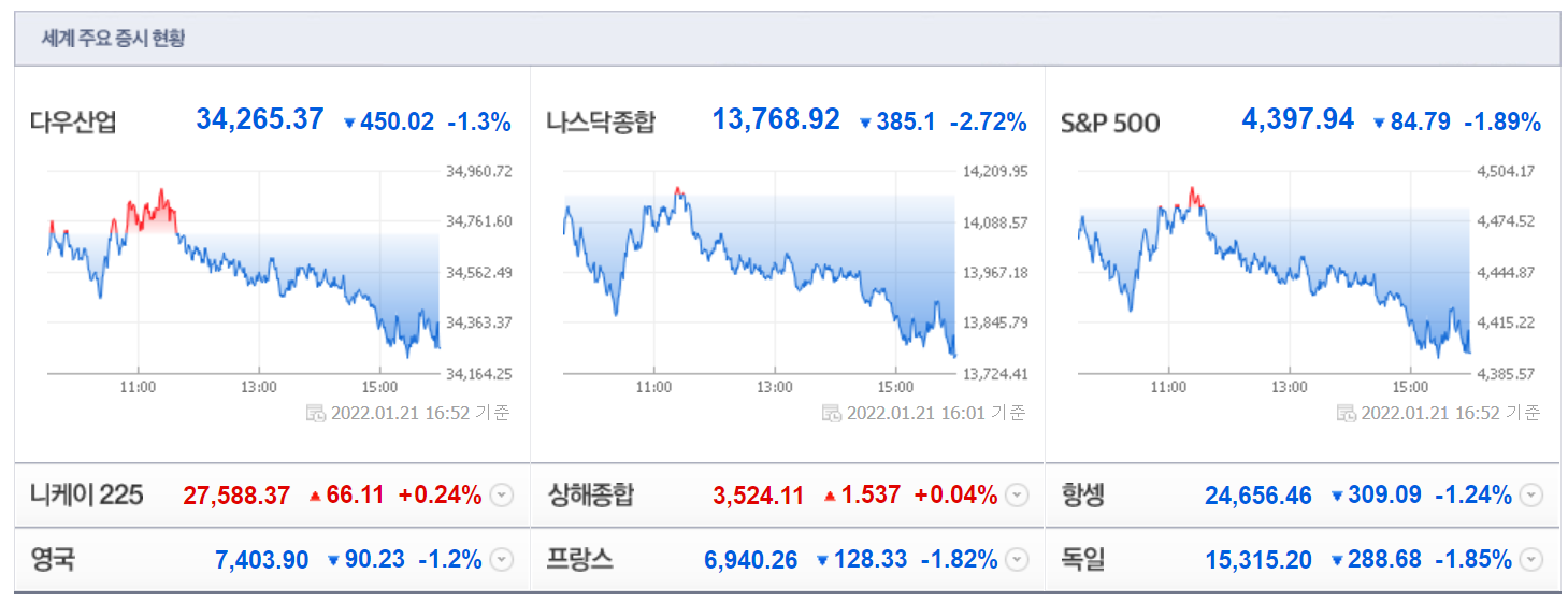 | ▷현지시간 21일 Fed의 긴축 우려 지속, 기업 실적 부진, 기술주 부진 등에 뉴욕증시가 큰 폭의 하락세를보인 가운데, 국내증시도 큰 폭 하락. 외국인이 코스피, 코스닥시장에서 순매도를 나타냈으며, 선물시장에서도 순매도를 보이면서 증시 하락을 주도. ▷아울러, 미국이 우크라이나 주재 대사관 직원 가족에 대한 철수 명령을 내린데 이어 자국민의 러시아 여행을 금지하면서지정학적 리스크가 고조되고 있는 점도 국내증시에 하방압력으로 작용. ▷코스피지수는 1.5% 가까이 하락해 2,800선이 붕괴됐으며, 코스닥지수는 3% 가까이 급락해 920선 아래로 밀려남. ▷이와 관련, 한화투자증권, 유안타증권, DB금융투자, 유진투자증권 등 증권 테마가 하락세를 기록. |