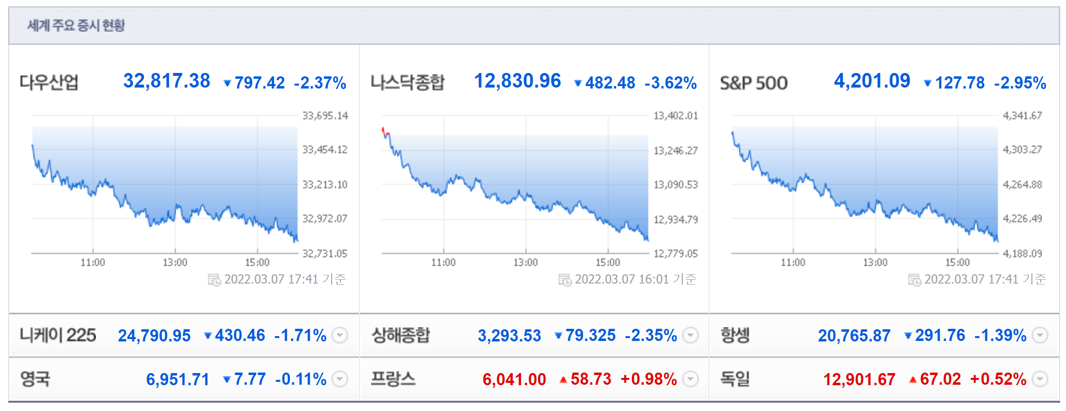 3/7(현지시간) 뉴욕증시가 러시아-우크라이나 전쟁 고조, 유가 급등 속 스태그플레이션 우려 등에 급락한 가운데, 주요 테마들도 대부분 하락. 특히, 애플(-2.37%) 등 모바일, 마이크로소프트(-3.78%) 등 컴퓨터, 아마존(-5.62%), 알파벳A(-4.19%), 메타(-6.29%) 등 인터넷, 넷플릭스(-3.17%) 등 미디어, 엔비디아(-6.91%) 등 반도체, 테슬라(-4.02%) 등 전기차 등 주요 기술주 관련 테마들이 연일 하락했고, 에어비앤비(-7.79%) 등 여행, 델타 항공(-12.78%), 아메리칸 에어라인스그룹(-11.99%) 등 항공, 윈리조트(-11.32%), 라스베가스샌즈(-11.52%) 등 카지노, 카니발(-9.87%) 등 크루즈 테마 등도연일 하락.