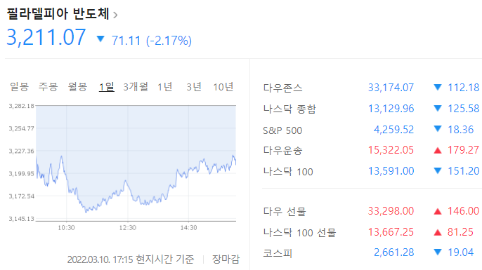 | ▷지난밤 뉴욕주식시장이 美 소비자물가지수 급등, 러시아-우크라이나 협상 결렬에 하락 마감한 가운데, 필라델피아반도체지수는 급락 마감했음. 지수는 전 거래일 대비 71.11(-2.17%) 하락한 3,211.07을 기록. 인텔(-2.04%), AMD(-4.13%), AMAT(-2.84%) ASML 등이 하락. 특히, 마이크론테크놀로지(-4.68%)는 러시아-우크라이나 사태 지속에 따른 반도체 제조 관련 핵심 소재 공급망 문제에직면해 있다는 우려가 불거지면서 하락 마감. 업계에서는 우크라이나 사태가 장기화 될 경우 네온 등 특수가스 공급 문제가 반도체 산업에 부정적으로 작용할 수 있다는 우려를 제기하고 있음. ▷이 같은 소식에 삼성전자, SK하이닉스, DB하이텍, 하나마이크론, 유진테크 등 반도체 관련주가 하락. |