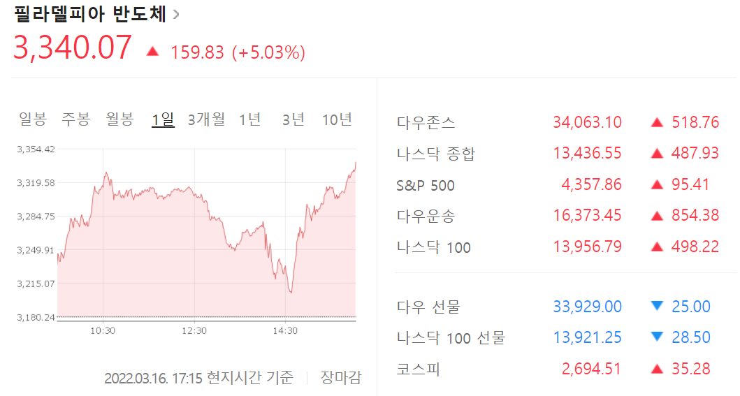 3/16(현지시간) 뉴욕증시가 3년 만의 금리 인상 속 파월 의장 낙관적 경제 전망 등에 급등한 가운데, 주요 테마들도 대부분 상승. 특히, 엔비디아(+6.63%)가 웰스 파고의 매수적기라는 분석 등에 상승했고, 마이크론 테크놀로지(+8.97%)는 번스타인이 투자의견을 두 단계 상향 조정했다는 소식에 급등, 인텔(+4.06%)은 전일 발표한 대규모 투자 계획 소식 등에 상승하는 등 반도체 테마의 강세가 두드러짐. 애플(+2.90%) 등 모바일, 마이크로소프트(+2.52%) 등 컴퓨터, 아마존(+3.89%), 알파벳A(+3.16%), 메타(+6.04%) 등 인터넷, 넷플릭스(+4.01%) 등 미디어, 테슬라(+4.78%) 등 전기차 등 주요 기술주 관련 테마들도 일제히 상승. 3년 만의 금리 인상 속 JP모건체이스(+4.47%), 골드만삭스(+3.52%), 뱅크오브아메리카(+3.13%), 웰스 파고(+2.97%) 등 은행, 마스터카드(+2.89%) 등 카드 등 금융 테마도 상승.