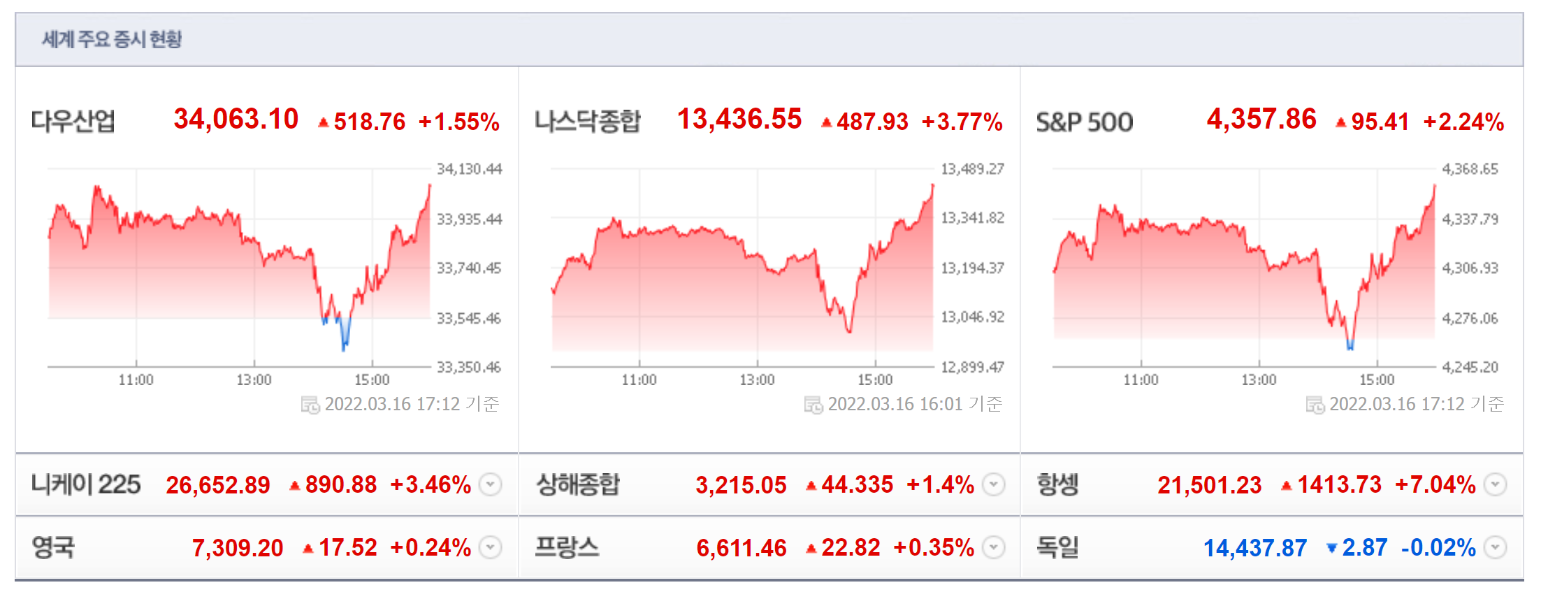| ▷지난밤 美 증시가 3년만의 기준금리 인상 속 파월 의장 낙관적 경제 전망 등에 상승. Fed가 3월 FOMC에서 3년 만에 금리를 인상했지만, 금리 인상폭이 시장 예상과 일치한 가운데, 파월 의장이 경제에 대해 낙관적인 발언을 이어가며 3대 지수 모두 급등. 특히, 나스닥지수는 전일 대비 3.77% 상승한 13,436.55에서 거래를 마감했고, 애플(+2.90%), 메타(+6.04%), 테슬라(+4.78%), 알파벳(+3.16%) 등 주요 기술주들도 동반 상승. ▷이 같은 소식에 금일 NAVER, 카카오 등 인터넷 대표주도 상승세를 기록. 한편, NAVER는 한성숙 전 CEO ‘유럽사업개발 대표’ 발령 소식 속 유럽시장 진출 확대 기대감도 부각. |